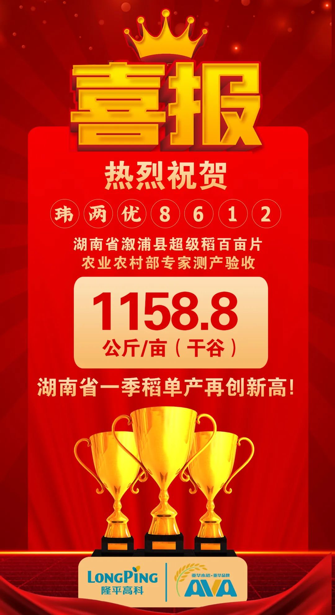 2021年,玮两优8612在隆回县羊古坳镇农业农村部超级稻百亩示范片测产亩产干谷为1114.8公斤,创造湖南省一季稻高产纪录,并被收录于央视《种子 种子》纪录片。近两年玮两优8612推广面积超过150万亩,实际增产超过1.5亿公斤,为农户增收3亿元以上,积极响应了中央“藏粮于技”的国家粮食安全战略,为保障国家粮食安全、农户增收作出应尽贡献。