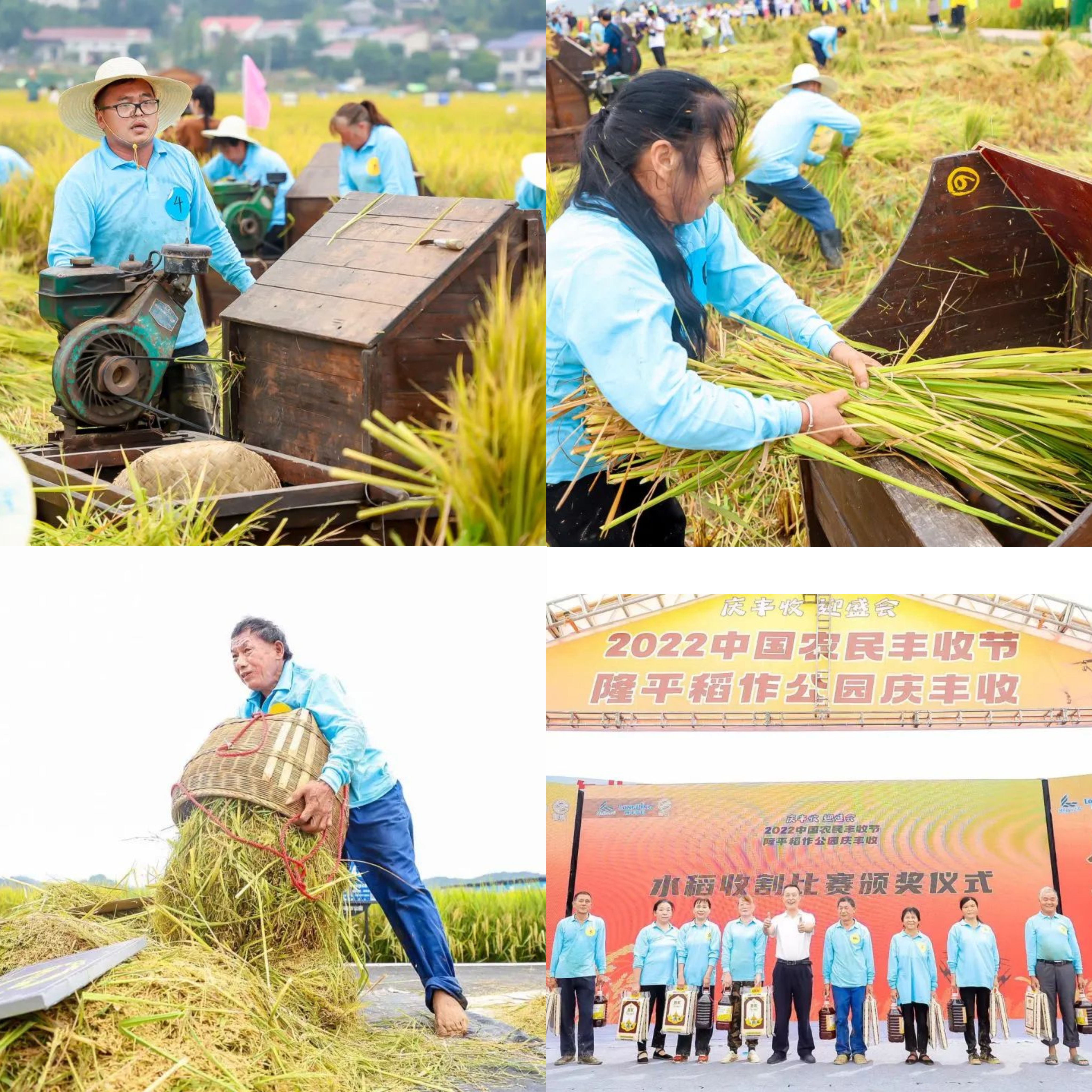 现场举行了收割大赛,比赛分为六个组同时进行,收割同等面积水稻,根据最终收割时间得出排名。各小组全力以赴,你追我赶,一派欢乐喜庆的景象。