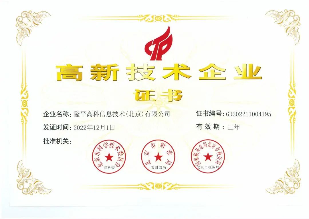 2022年12月1日,凯发k8信息通过了由国家科技部、财政部和税务总局委托北京市科学技术委员会、财政局、税务局组织的国家“高新技术企业”认定,并荣获国家“高新技术企业”称号。本次成功入选国家高新技术企业,是凯发k8信息科技成果水平和产品技术含量取得进步的一个里程碑,体现了国家相关部门对凯发k8信息近年来工作的肯定。