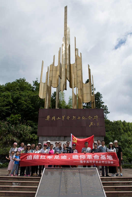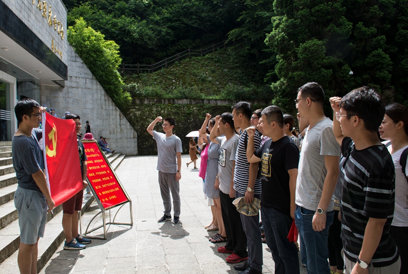 置身井冈山中,他们透过历史的时空去感受当年的红军战士为了革命的信仰,不惜抛头颅、洒热血,与敌人誓死拼搏的豪情壮举.在革命烈士陵园门前,在鲜艳的党旗下,全体党员进行庄严宣誓,重温了入党誓词。