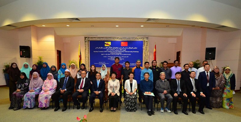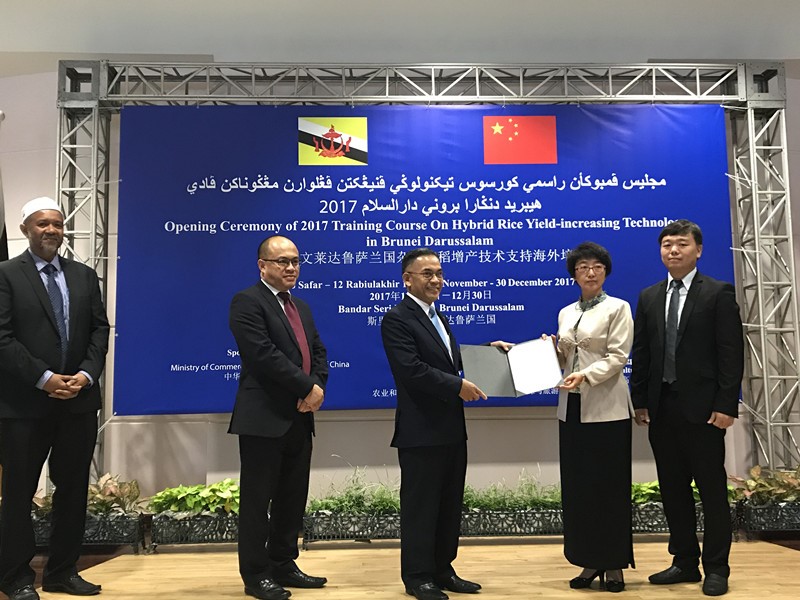 开班仪式上杨健与DOTA.Ali就培训物资进行了交接。周丹与文莱初级资源与旅游部农业及农产品司司长签署了杂交水稻技术与培训合作备忘录。