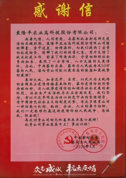 中共蔡甸区委、蔡甸区人民政府对公司在新冠肺炎疫情暴发期间的同心抗疫之举发来感谢信。