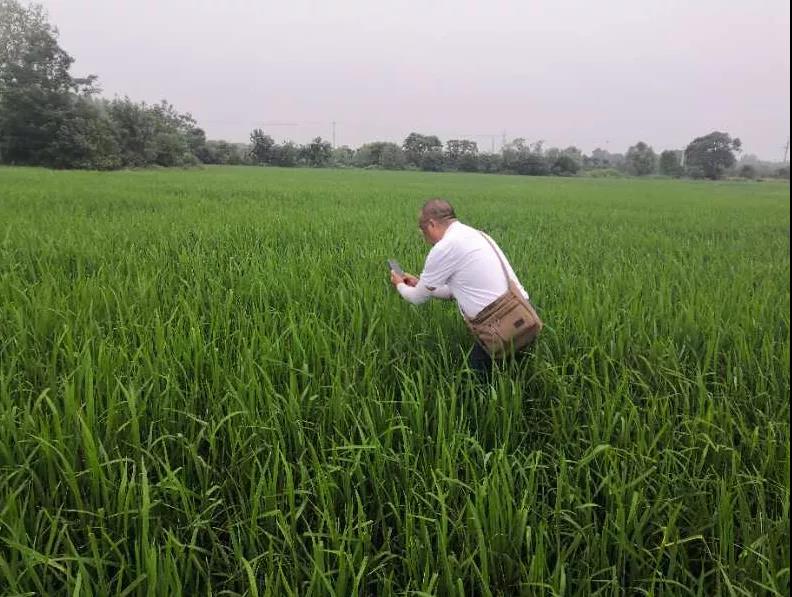 △ 岳阳市岳阳县中洲乡,120亩隆两优1308高产示范基地完成直播两个多月,农技专家查看田间情况,并与当地村支书及多位农户沟通了解种植情况后提出技术指导建议。