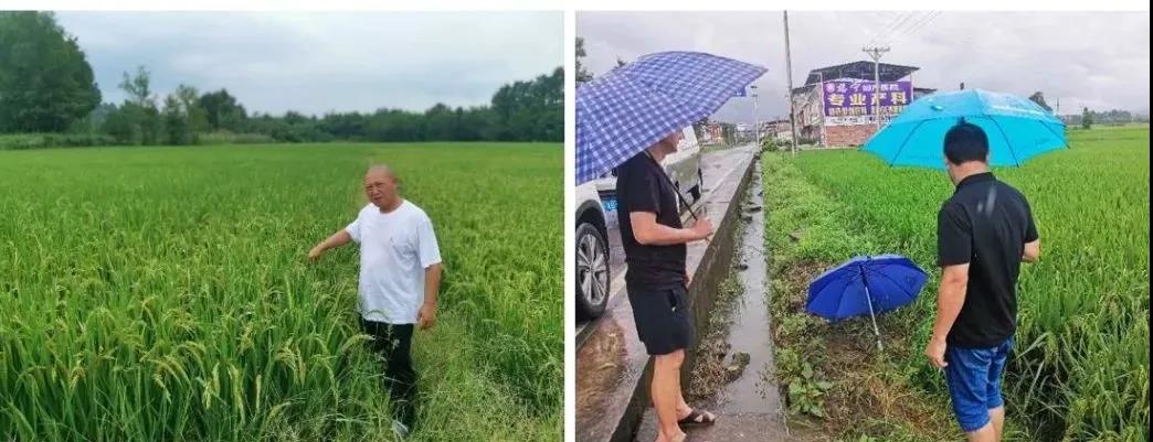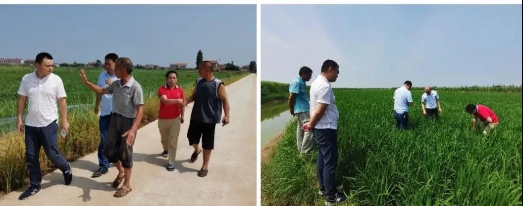 △ 平江县三市镇高和村,种植大户王先生承包并种植了120多亩隆两优1308,前期暴雨时,田间被泥水冲刷,农技专家组下田观察实际情况后,对病虫害防治等进行技术指导。
