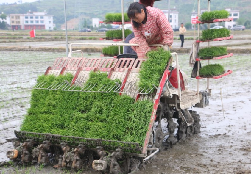 柳绿桃红万物滋,农夫驾机耕种忙。